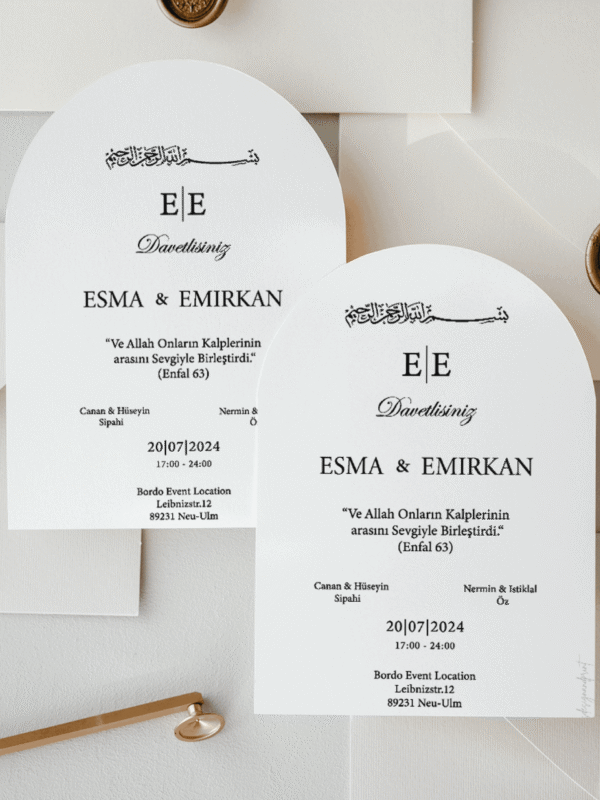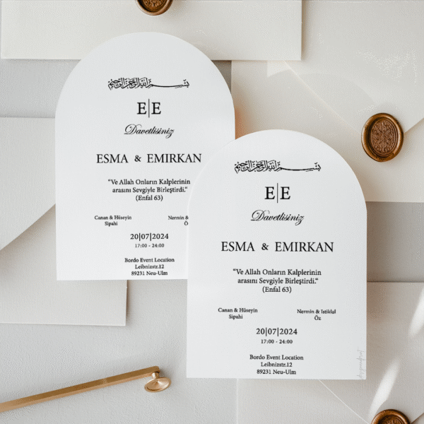 Mit ihrer eleganten Bogenform im edlen A5-Format und dem matten Premiumpapier (250g) überzeugt diese Einladungskarte durch zeitlose Schlichtheit und hochwertige Haptik. Die harmonisch geschwungene Silhouette verleiht der Karte eine moderne, zugleich traditionsbewusste Ausstrahlung – perfekt für besondere Anlässe mit stilvollem Anspruch.