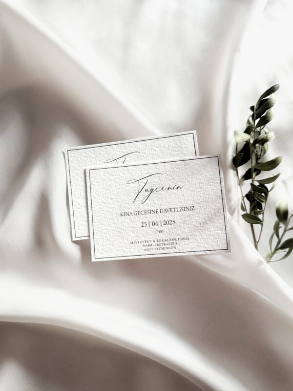 Mit ihrem handlichen 10,4 x 7,4 cm -Format und dem edlen, strukturierten 300g-Papier beeindrucken diese Einladungskarten durch ihre stilvolle Zurückhaltung und hochwertige Haptik. Die feine Oberflächenstruktur verleiht jeder Karte eine besondere Tiefe und Eleganz – perfekt für minimalistisch edle Anlässe mit persönlicher Note.